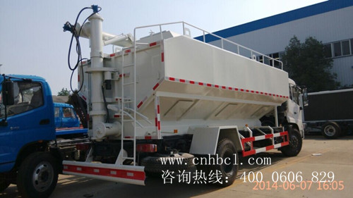 液壓式散裝飼料車特點及圖片展示,液壓式散裝飼料車的飼料罐架設在卡車的底盤上,專用設施由罐體總成、輸送系統(水平卸料系統、垂直卸料系統以及活動卸料系統組成)、液壓系統(高壓油泵經管路與分配閥連接該閥的三個輸出端分別是轉角液壓馬達、升降油缸以及串聯在一起的水平卸料、垂直卸料、活動卸料液壓馬達)、電動系統、氣動分倉機構等組成。在罐體底部設有閘門,在閘門下面裝有水平螺旋輸送器(俗稱水平攪籠),由取力器由汽車變速箱輸出動力驅動,再傳動高壓油泵以驅動液壓系統,液壓馬達通過傳動裝置帶動水平螺旋輸送器的葉片軸及葉片旋轉, 經活動輸送系統(俗稱活動攪籠)以將飼料輸出。車頂平置的一根活動卸料絞龍可自由回轉和抬升,運輸時,頂部的螺旋管平臥在罐頂;卸料時則抬起,使管端的出料口與畜禽飼養場貯料罐頂部的進料門相接、對準,完成卸料。具體圖片展示如下: