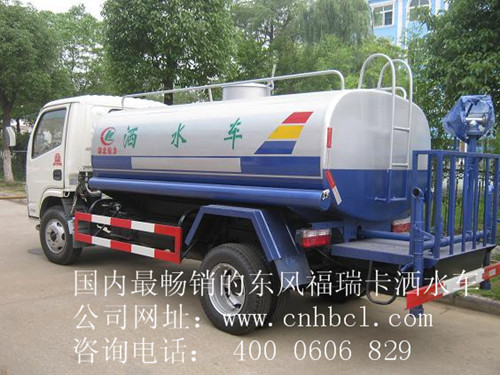 東風(fēng)福瑞卡灑水車前裝有鴨形噴嘴或圓頭沖嘴,灑水車后面裝有圓柱開灑水噴嘴或蓮蓬頭噴嘴,后部有一工作平臺,裝配有水炮。后部還可裝8個噴嘴(選裝)噴水器一般用于沖洗街道,起除塵和降溫作用,其噴水器可以用調(diào)節(jié)噴嘴螺紋的方法改變噴水器的噴灑方向和角度,高射水炮可以用于城鄉(xiāng)園林綠化及應(yīng)急消防。蓮蓬嘴可以澆落路中間噴水器沖起的灰塵,起到清潔空氣的作用,配備全國評比第一的杭州威龍專用水泵,帶兩根吸水管,配鎖,帶消防接頭,帶自流閥,水位計,作業(yè)高音喇叭,起到自吸自排的功能。灑水車罐體伸出與水龍頭連接口。