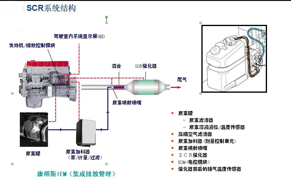 電控+SCR技術是通過使用選擇性催化還原(SCR)技術,利用尿素溶液對尾氣中的氮氧化物進行處理。車用尿素溶液存放于專門儲存罐,用壓縮空氣將尿素溶液噴灑向熱的發動機尾氣(約300℃-500℃),氣化后產生還原效率高的氨氣,氨氣與尾氣的NOx 在SCR 催化器中反應,轉化為無害的水蒸汽和N2,同時吸收有害的煙氣顆粒;SCR即選擇性催化還原系統,將尿素溶液噴射到排氣管內,尿素高溫分解為氨氣NH3和二氧化碳,其中氨氣與氮氧化物NOx發生反應,將其還原為氮氣和水。