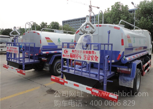 灑水車前裝有鴨形噴嘴或圓頭沖嘴,后面裝有圓柱開灑水噴嘴或蓮蓬頭噴嘴,后部有一工作平臺,裝配有水炮。后部還可裝8個噴嘴(選裝)噴水器一般用于沖洗街道,起除塵和降溫作用,其噴水器可以用調節噴嘴螺紋的方法改變噴水器的噴灑方向和角度,高射水炮可以用于城鄉園林綠化及應急消防。蓮蓬嘴可以澆落路中間噴水器沖起的灰塵,起到清潔空氣的作用。