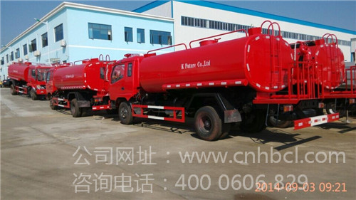(四)冬季放水: 消防灑水車因為消防特征的需要,時刻處入戰備狀態(液罐滿載),冬季來臨,當設備所處環境溫度在零下時(有暖房的除外),必須關閉水罐與消防泵的球閥,切斷水源,同時打開消防泵、取力器、消防炮及消防管網球閥放水開關,排除殘水,以免凍裂設備.