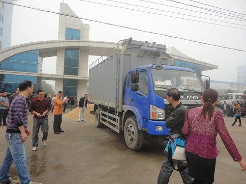 散裝糧食運輸車的側門是為了方便散裝糧食運輸車當廂式車使用而設置的,這也是散裝糧食運輸車的一大優勢,一車兩大用途充分發揮了專用車的特長。散裝糧食運輸車的底盤是福田時代的,發動機兩款可選:玉柴130馬力和云內130馬力。輪胎為8.25-20尼龍胎,后橋為9噸、前橋為3噸,后有5檔副變速箱、斷氣剎,可帶方向助力,糧廂舉升高度5.8米。散裝糧食運輸車的整車型號為CLW5100ZLSB4,可以上公告查詢。整車糧廂長4.7米、寬2.2米、高2.1米。糧廂本來容積有20立方,但是因為糧廂前端有40公分用于裝置脈沖除塵器,所以實際容積是18立方。實際上根據裝載糧食的種類不同密度不同容積也不一樣,像稻谷實際裝載是18×0.55=10噸,小麥18×07=12.5噸。密封式糧箱的材料是用邊3底5的優質鋼材焊接而成的,糧箱有后門和右方的側開門。后門用于卸料,可以直接卸到傳送帶上,也可以卸到糧倉里面。