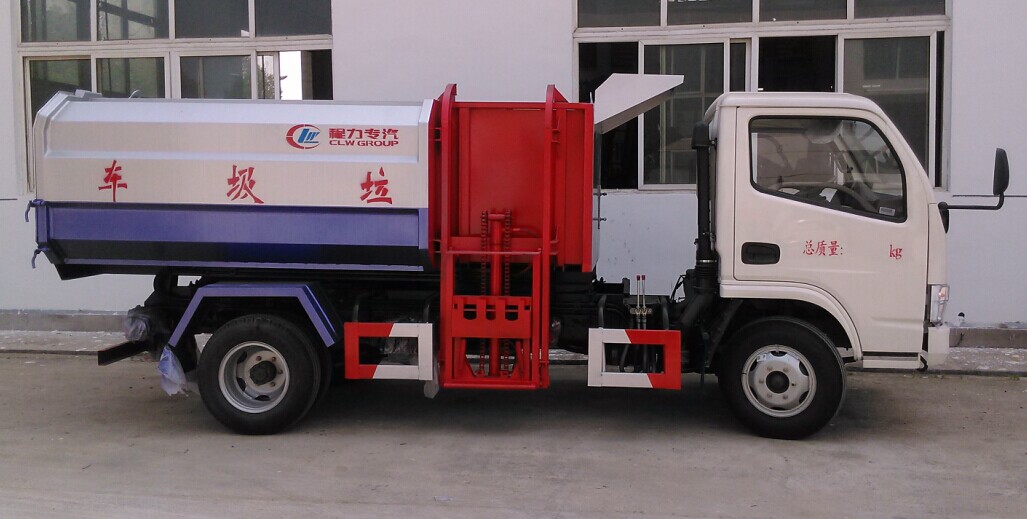 5、在卸垃圾前,整車運轉達到6個標準氣壓,時掛上取力器,打開垃圾箱后門鎖緊裝置,在前級二聯多路閥處,首先確定鎖緊架鎖緊垃圾箱體,然后拉起拉臂操作手柄至伸出位置,垃圾箱體備傾斜舉起垃圾卸出。