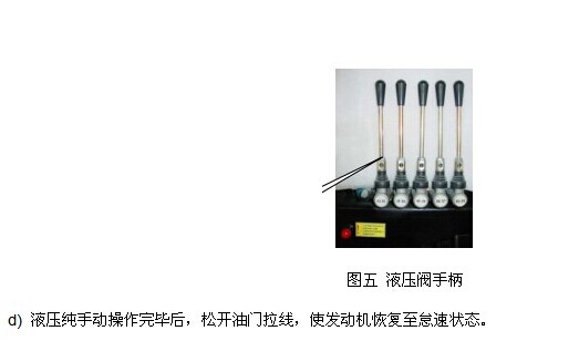 b)采用液壓閥手柄操作時,發動機不能處于怠速狀態,務必使發動機轉速高于 1200轉/分(可調整油門拉線)。
