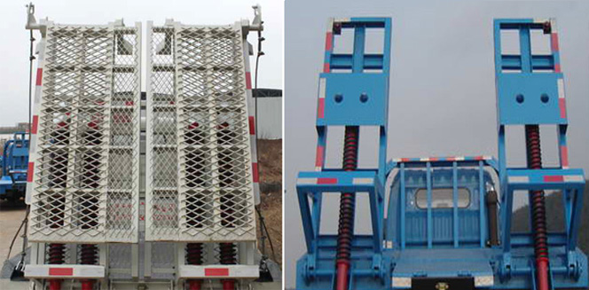 此款藍牌挖機運輸車可設計成向后伸長500mm,可運載80-120挖機,平板面采用5mm厚國標花紋板,橫梁采用100x100x5的國標方管,橫梁加密,每300mm一根橫梁,邊框使用120槽鋼固定,平板運輸車的承載能力更大,受力更均勻;尾部帶有雙彈簧爬梯和可折疊式支腿,爬梯上焊有16的螺旋鋼,板面上也焊有螺旋鋼,挖機上去的時候不會打滑,在挖機上去的時候將支腿放下,4點著力,車頭不會翹起,安全性能更強。