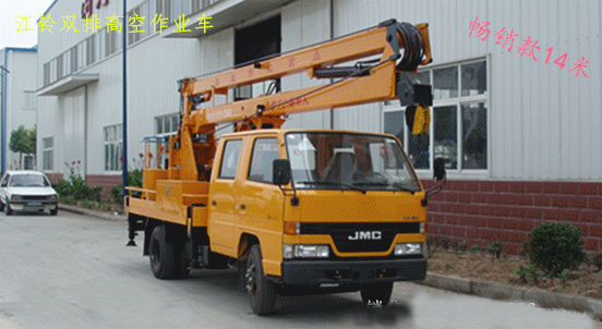 江鈴14米高空作業車采用江西鈴雙排座歐四(國四)底盤加裝上裝部分而成,采用液壓式二節(或三節)折疊臂,最大作 業高度13.5-14米,作業幅度5.7-6.5米。
