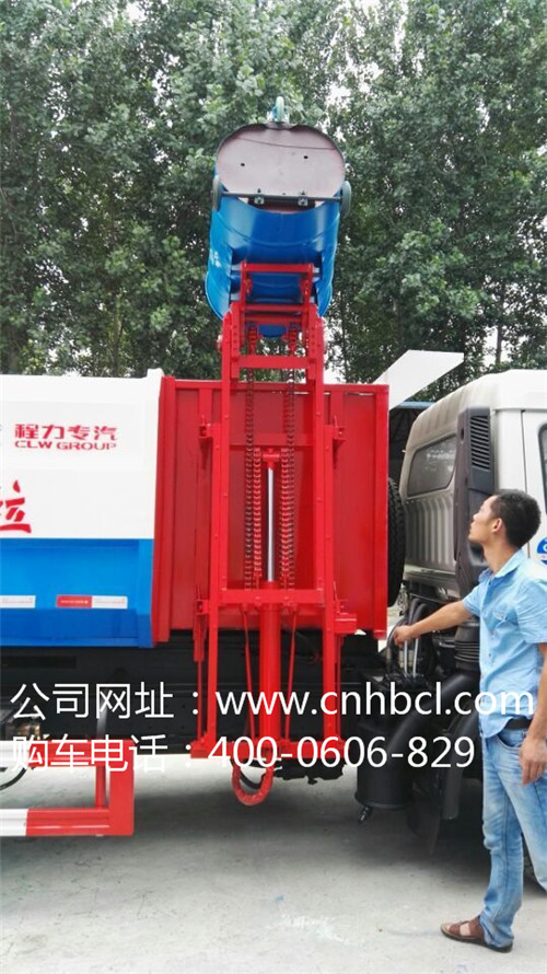 以上8方側裝掛桶式垃圾車是這次四川涼山客戶訂購的車型配置及參數(shù),圖片介紹,下面跟隨小編一起了解一下側裝掛桶式垃圾車是如何傾到垃圾如下圖: