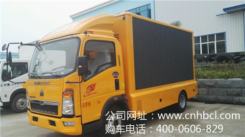國四重汽豪沃P8LED廣告車整車型號:CLW5040XXCZ4型宣傳車 ,底盤型號:ZZ1047C3414D145,整車尺寸:5995X2030X3050(mm),這款國四藍牌LED廣告車底盤采用重汽豪沃1880單排駕駛室,錫柴87馬力國四發動機,5檔變速箱,7.00-16輪胎,動轉,斷氣剎,軸距:3360mm,這款國四LED廣告車右屏為條屏字幕加滾動燈箱如圖: