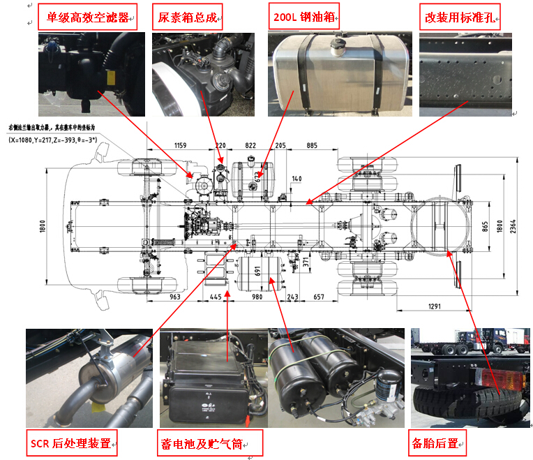 圖1 CA1160P62K1L2A1E4Z型環(huán)衛(wèi)車底盤布置圖及細(xì)節(jié)圖