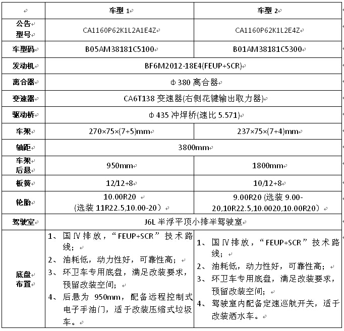 為滿足市場需求,解放公司開發(fā)了J6L國ⅣCA1160P62K1L2E4Z及CA1160P62K1L2A1E4Z型專用4×2環(huán)衛(wèi)車底盤。該系列底盤發(fā)動(dòng)機(jī)功率范圍涵蓋121—165kW,采用“FEUP+SCR”技術(shù)路線,達(dá)到國Ⅳ排放,具有動(dòng)力性好,油耗低,可靠性高等特點(diǎn)。本次推介3800mm軸距的環(huán)衛(wèi)車底盤,適于改裝壓縮式垃圾車和灑水車。