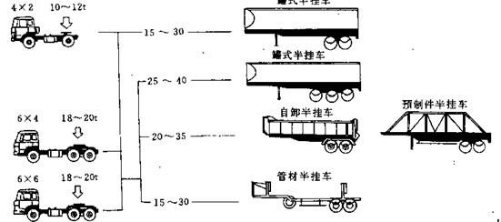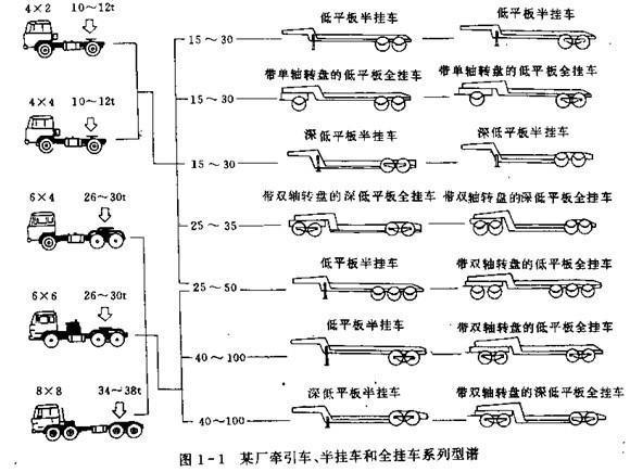 (3)針對(duì)專(zhuān)用汽車(chē)品種多,批量少的生產(chǎn)特點(diǎn),專(zhuān)用汽車(chē)設(shè)計(jì)應(yīng)考慮產(chǎn)品的系列化,以便根據(jù)不同用戶(hù)的需要而能很快的進(jìn)行產(chǎn)品型圖1-1為某廠(chǎng)牽此車(chē),半掛車(chē)和全掛車(chē)系列型譜。對(duì)專(zhuān)用汽車(chē)零部件的設(shè)計(jì),應(yīng)按“三化”的要求進(jìn)行,最大限底地選 用標(biāo)準(zhǔn)件,或選用已經(jīng)定型產(chǎn)品的零部件,盡量減少自制件。