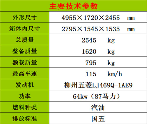 ①整車尺寸4955×1720×2455mm;箱體尺寸2795×1545×1535mm,有效容積6.6立方,箱體尺寸標準,誤差小,方便落戶.