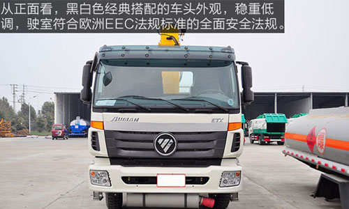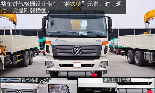 整車進氣格柵設計帶有“鋼鐵俠”元素,時尚現(xiàn)代,突顯剛毅穩(wěn)固,進氣格柵中間鑲有福田公司專用logo,動感十足。整車大燈置于保險杠兩邊,低角度照明加大安全行駛,保險杠中間有拉鉤,用于牽引車輛,黑漆封釉,若隱若現(xiàn)。保險杠下方是發(fā)動機排氣管,采用前置式結構,更安全。