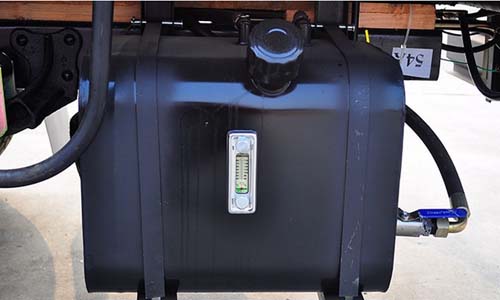 液壓油箱加裝在車輛一側,為上裝液壓部件工作提供了足夠的原動力,油箱上還有一個溫度顯示儀,標有攝氏度和華氏度兩種顯示刻度,方便用戶掌握情況。