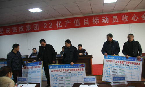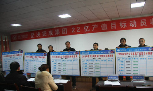 完成2016年目標任務:產值22億元;實行層層分解目標任務,其中整體情況、專汽制造、底盤代理、專業廠、油化公司、新能源汽車、集團成員企業等指標完成情況要上墻,分解到月度考核,每月統計,欠產查原因、找差距、定措施,確保月清日結。提高產品質量,去庫存、降消耗、上新品。