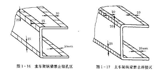 c、在縱梁的邊,角區域亦禁止鉆孔或焊接,如圖1-16,圖1-17所示的區域即為不允許鉆孔和焊接加工的部位。因為在這些部位進行鉆孔或焊接,極易引起車架早期開裂。