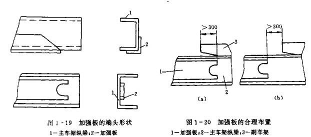 加強板的截面形狀推薦選用L型,其厚度應不小于車架厚度的40%,L型加強板的翼面應貼合在車架縱梁翼面受拉伸的一邊。加強板的端頭形狀應逐步過渡,如切成小于45度的斜角,或在端頭中部開光滑槽,如圖1-19所示。