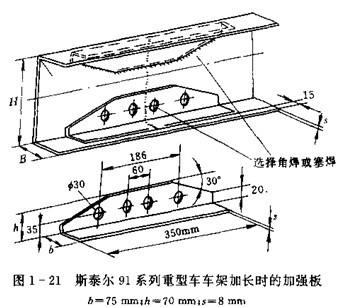 圖1-21為斯泰爾91系列重型車車架末端加長超過200mm時,所用的兩塊加強板的結構和盡寸。加強板和主車架縱梁腹板的固定采用圓孔塞焊和角焊,但只能焊接在主車架縱梁的腹板上。加強板兩端頭以及距兩端頭10mm的區間內嚴禁焊接。