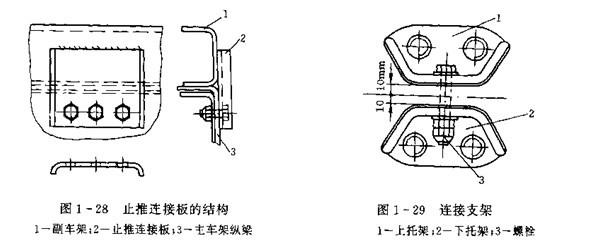 連接支架由相互獨立的上、下托架組成,上、下托架均通過螺栓分別與副車架和主主車架縱梁的腹板相固定,然后再用螺栓將上、下托架相連接,見圖1-29所示,由于上、下托架之間留有間隙,因此連接支架所能承受的水平載荷較小,所以邊支架應和止推連接板配合使用。一般布置是在后懸架前支座前用連接支架連接,在后懸架前支座后用止推連接板連接。