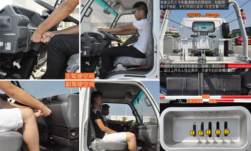 該車配備的為汽剎,并沒有采用斷氣剎,在配置上較競品而言略有欠缺。取力器掛檔開關(guān)裝在主駕座椅左側(cè),方便用戶在拖車時直接能掛上,之后再進行工作。副駕門的設(shè)計也是很有立體感,每個部件看著都特別扎實耐用,由此看來真是一分錢一分貨。在駕乘空間方面,雖然車身比較窄小,但是內(nèi)部空間卻絲毫不顯擁擠,主駕和副駕體驗者對空間均表示很滿意,能充分的活動開了,完全沒有一般輕卡的束縛感。