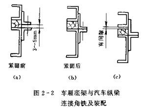 車廂與底盤的連接實際上就是將車廂底架(副車架)縱梁緊固在底盤的縱梁上,一般同時采用角鐵連接與傳統的U型螺栓連接,以提高連接的可靠性,角鐵連接如圖2-2所示,為避免出現裝配后連接面產生間隙(圖2-2(c)),緊固前,上下角鐵之前應有合適的間隙(圖2-2(a)),緊固后保證連接面能緊密貼合(圖2-2(b)).