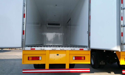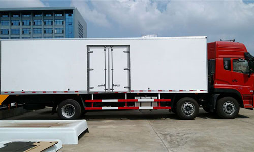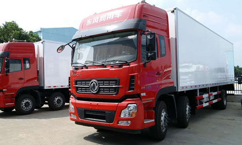 東風天龍小三軸9.5米冷藏車采用高頂雙臥駕駛室,整車型號:CLW5250XLCD4,底盤型號:DFL1253AX1A,整車尺寸(mm):11990*2550*3990,廂體尺寸(mm):9400*2300*2400,國四柴油東風康明斯發動機220馬力,冷藏保溫廂體采用聚氨脂泡保溫層,門框、門飾件全部使用不銹鋼,加裝側門,加裝底板不銹鋼通風槽,安裝制冷機組,溫度達到零下5度,其余標配。
