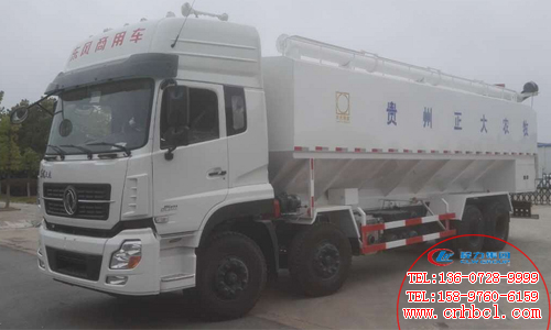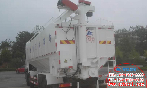 東風天龍前四后八散裝飼料運輸車上裝配置:有效容積40方,可裝25噸,標配4倉,電動絞龍卸料,卸料管傾斜70度, 垂直卸料高度8.5米,整車卸料完用時40分鐘。