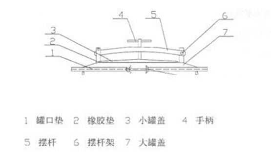 6、罐體組件(附圖二):罐口為直徑Φ410mm的孔,以供維修保養進出罐體之用。大蓋由卡箍及螺栓緊固在罐口頸上,小蓋板由一個支銷和一個耳板將其與大蓋板連接在一起,順時針轉動小蓋上手柄,可使小蓋板壓緊。反轉,脫開耳板后,小蓋板可打開用于加水。