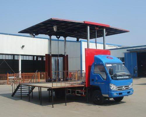 湖北程力舞臺車_流動舞臺車廂體整體采用鋁型材和沖壓件組合骨架,外板為鋁合金平板,內飾為防水膠合板,舞臺板為專用舞臺防滑板。右側外板及頂板右側通過液壓舉升至與臺面垂直位置,形成遮陽、擋雨、燈光固定的頂棚及廣告的承載面。右側內板(舞臺板)為兩折疊,通過液壓翻轉后作為舞臺,舞臺左右加裝延展板,前面加裝T型臺。