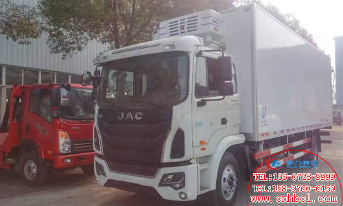 國五江淮格爾發冷藏車整車型號:HFC5161XLCP3K1A57V型冷藏車 ,底盤型號:HFC5161XXYP3K1A47V,軸距:4700mm,5000mm,外形尺寸:8580,9230,10000X2550X3950(mm),貨廂尺寸:6230,6830,7600X2350X2430 (mm),總質量:16000(Kg),額定載質量:8805kg,整備質量:7000kg。