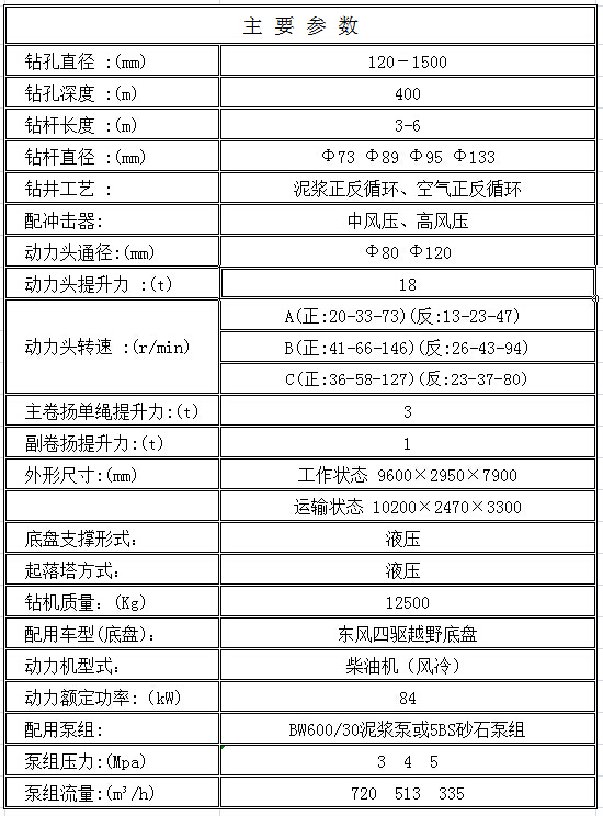 ●此機型是采用車載自走式,鉆機選用東風四驅越野底盤,動力強勁,爬坡有力, 適合在礦區、野外等環境惡劣的地方作業。柴油機、變速箱、傳動箱、換向箱、動力頭、提升卷揚機、鉆塔、底架、操縱系統、孔口裝置、液壓起塔系統、BW600/30泥漿泵、發電機組等都安裝在汽車底盤上。