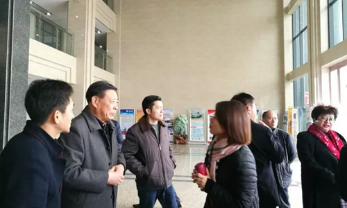 市汽車行業協會秘書長王君峰(左一)、程力黨委書記何儒安(左二)與部分考察團代表總部大廳駐足暢聊。 程力汽車集團總經理程阿羅,黨委書記何儒安,黨委副書記、辦公室主任楊祖國,辦公室副主任童明等領導參加了接待工作及溝通交流會。