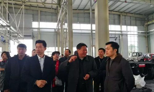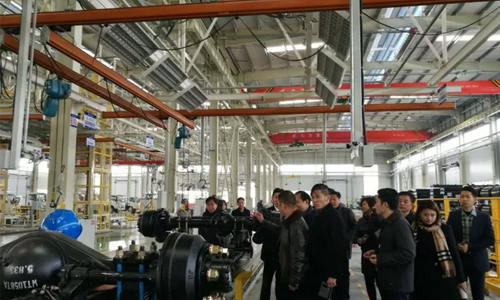 參觀程力商用車工業園車間現場,程力公司黨委書記何儒安(右二)向嘉賓介紹情況。