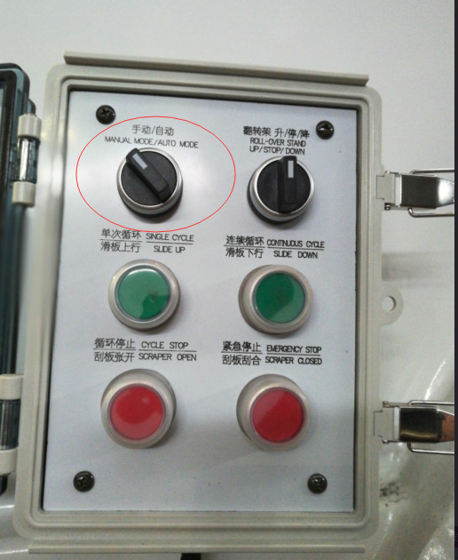 B、在自動模式.按下綠色單次工作按鈕,操作系統(tǒng)即自動完成一次滑板刮板向垃圾箱內(nèi)轉(zhuǎn)移垃圾循環(huán), ,如果垃圾斗里的垃圾多了, 可以選擇連續(xù)循環(huán)按鈕,垃圾轉(zhuǎn)移完畢.按下方紅色按扭停止。