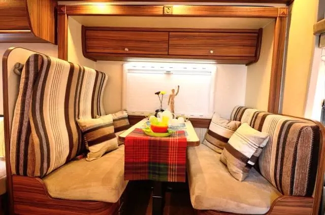 會客區,標準的雙人對坐卡座沙發,可供四人聊天聚餐。側面窗戶上方還置有兩個木質吊柜,可供存放物品。該區域在駐車時可拓展,增加車內空間。