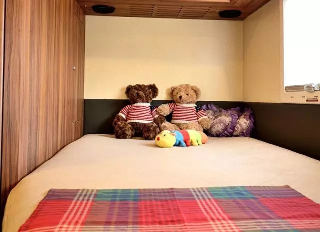 車廂后部的雙人床,尺寸尚可,睡兩個彪形大漢會略顯擁擠的,但是一般體型的成年人還是夠用。況且兩位大漢相擁而眠的情況一般不會出現,畢竟畫面過于辣眼睛……