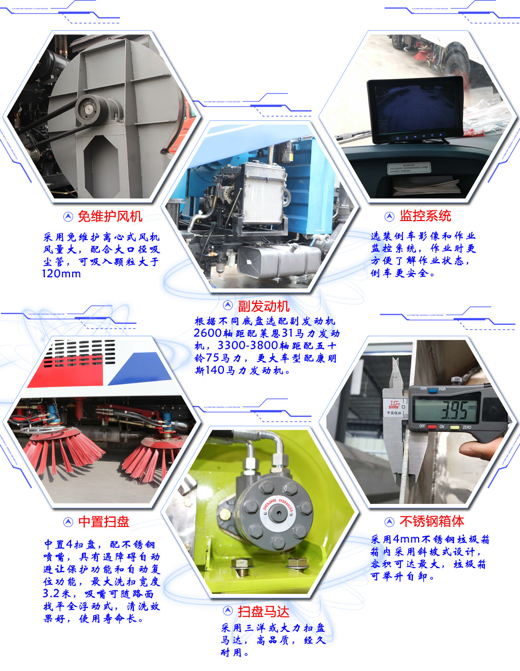 此車為大型掃路車,最大吸掃寬度為3.4米,適合各種公路,國道,城市主干道清掃,對道路有極好的清掃,除塵效果。 康明斯160馬力副發動機,5方水箱,8方垃圾箱。強力風機,進口電子液壓件!