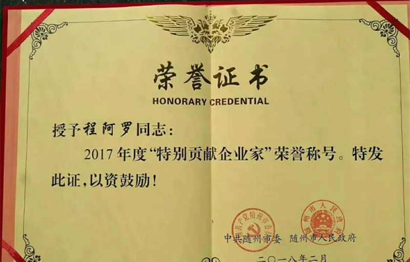 2月22日,隨州市市委、市政府在全省電視會議上表彰程力公司及程阿羅總經理分別獲得特別貢獻獎和特別貢獻企業家榮譽稱號。
