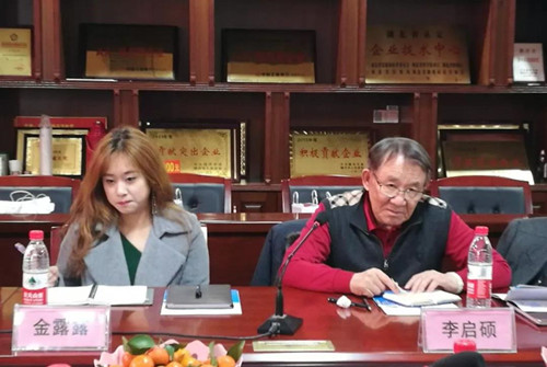 韓方株式會(huì)社社長(zhǎng)李啟碩(右)、商務(wù)總監(jiān)金露露(左)作工作交流。