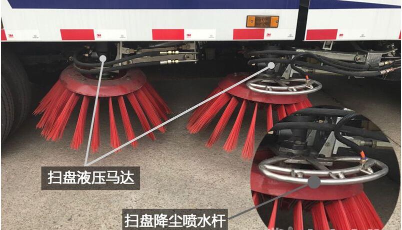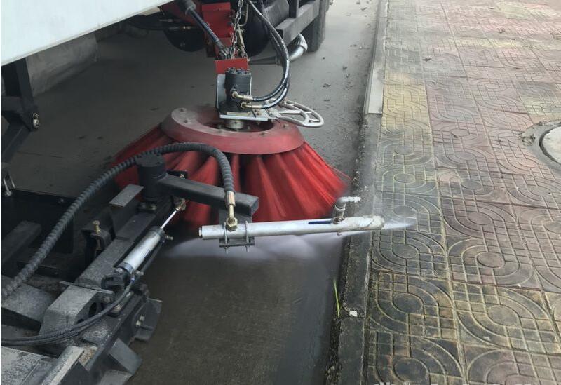 為了減少在清掃過程中二次揚塵污染,掃路車在左、右前掃盤上方裝有噴水嘴產生噴霧進行抑塵(可根據客戶需求,加裝前沖和后灑)。