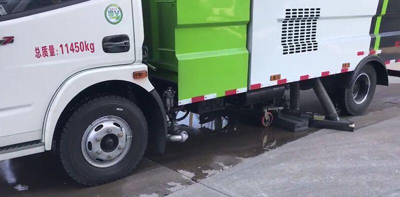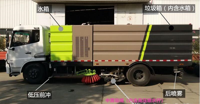 洗掃車結合了掃路車和高壓清洗車的功能,一般標配兩個中置掃刷,中置超寬吸嘴(內置高壓噴水桿)。洗掃車在作業時由高壓噴水桿噴出高壓水流,可沖起路面頑固附著物,由吸嘴連同水和垃圾一起吸進垃圾箱。由于洗掃車在作業過程中耗水量較大,所以水箱比較大,因此洗掃車都由軸距在3800以上底盤改裝而成。