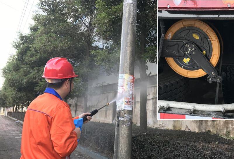 洗掃車隨車配備17米高壓沖水卷盤和高壓水槍一把,清理馬路人行道和小廣告更加便捷高效。