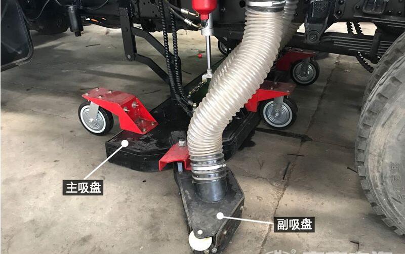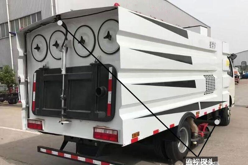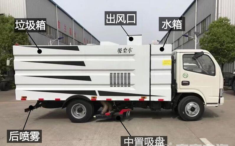 吸塵車標配沒有掃刷(可加裝),中置寬幅吸嘴,垃圾箱內部裝有濾筒進行降塵,垃圾只進不出,沒有二次揚塵污染,尾部裝有后噴水嘴進行路面噴灑保濕。