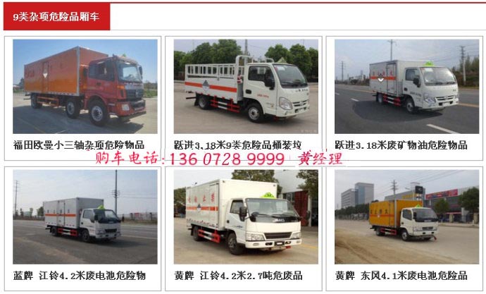 八類腐蝕性物品運輸車:該車主要用于運輸具有獨立容器(瓶)包裝的氨溶液(氨水),甲醛溶液,除銹磷化液(除銹磷化處理劑),電池,電池液,木餾油,類項號:8。 九類雜項危險品運輸車:主要用于運輸具有獨立(瓶)包裝的含銅廢物,含鎳廢物,含鉛廢物,含鉻廢物,廢棄電池以及《國家危險廢物名錄》中危險廢物,類項號:9.危險廢物編號: HW21,HW22, HW26,HW31,HW46,HW49。