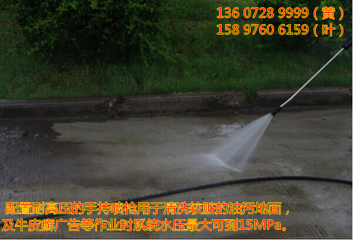 3、 配置耐高壓的手持噴槍用于清洗較臟的油污地面,及牛皮癬廣告等作業時系統水壓最大可到15MPa。