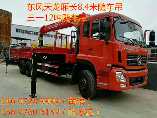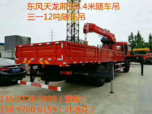 東風天龍廂長8.4米配三一12噸隨車吊底盤采用天龍駕駛室,豪華內飾,可選康明斯245_270馬力 陜齒9檔變速箱 ,前橋5噸 后橋雙10噸 300局部三層加強型大梁,1100鋼絲胎, 行駛記錄儀,氣囊座椅 原廠空調。上裝:三一12噸四節直臂上操作吊全液壓 全回轉。 貨箱尺寸:8400*2450*600mm。