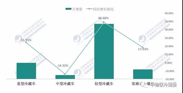 從上半年增量冷藏車的車型來看,輕型冷藏車強勢增長,增速高達48.48%,重型冷藏車增量同樣可觀,增速達到23.95%,中型冷藏車則加速萎縮,持續出現負增長,增量下跌了近15個百分點,廣泛應用于醫藥、食品末端配送的客廂式冷藏車穩步增長,同比增長17.93%。
