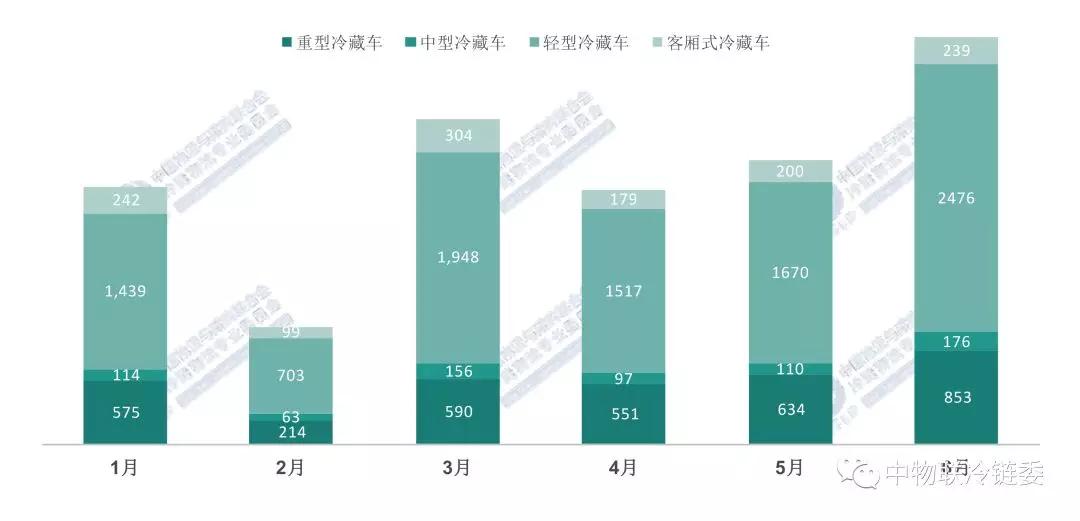 上半年,我國冷藏車市場增量十分可觀,冷藏車增長量約為18200臺,同比增長26.6%。其中,輕型冷藏車增長約11640臺,重型冷藏車增長約3750臺(含半掛車冷藏車約200臺),中型冷藏車約810臺,客廂式冷藏車約2000臺。增長量從3月份開始攀升,5月份達到峰值。