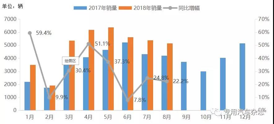 從2018年1~8月的月度銷量走勢來看,環衛車市場總體呈現增長態勢,累計銷售4.0萬輛,同比提升29.4%,各月均呈現不同程度的增長。