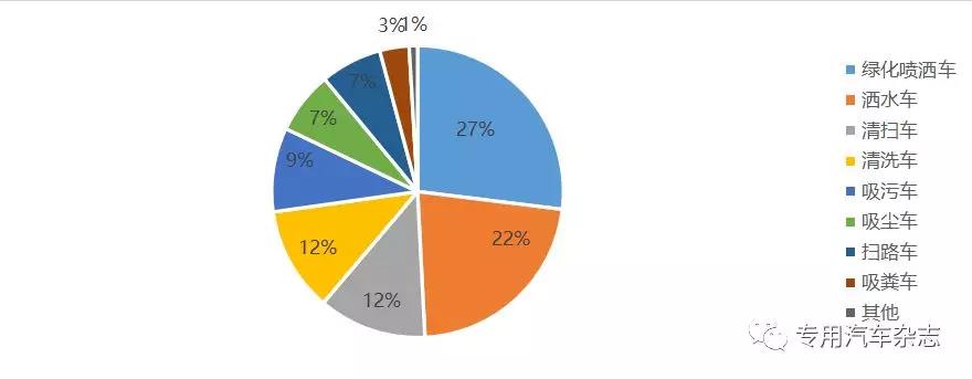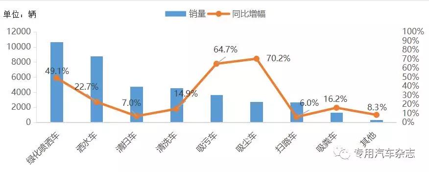從環衛車細分市場銷量表現來看,環衛車市場主銷車型為綠化噴灑車和灑水車,2018年1~8月市場比重分別為27%和22%,累計銷售分別為1.1萬輛和0.9萬輛,且均實現了同比大幅增長。其他主要細分市場中,吸污車和吸塵車同比增長較快,漲幅分別為64.7%和70.2%。